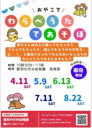 にこにこ広場は、就園前のお子さんのあそび場、お母さま方の交流の場です。 みんなで歌を歌う、粘土や絵具を楽しむ、緑豊かな園庭で砂場あそびや水あそびをします。 あそびにいらしてください。事前予約は不要です。 次年度幼稚園入園を問わず、歩けるようになったお子さんもあそびにきてください。 開催日は、ホームページのニュースでもお知らせしています。